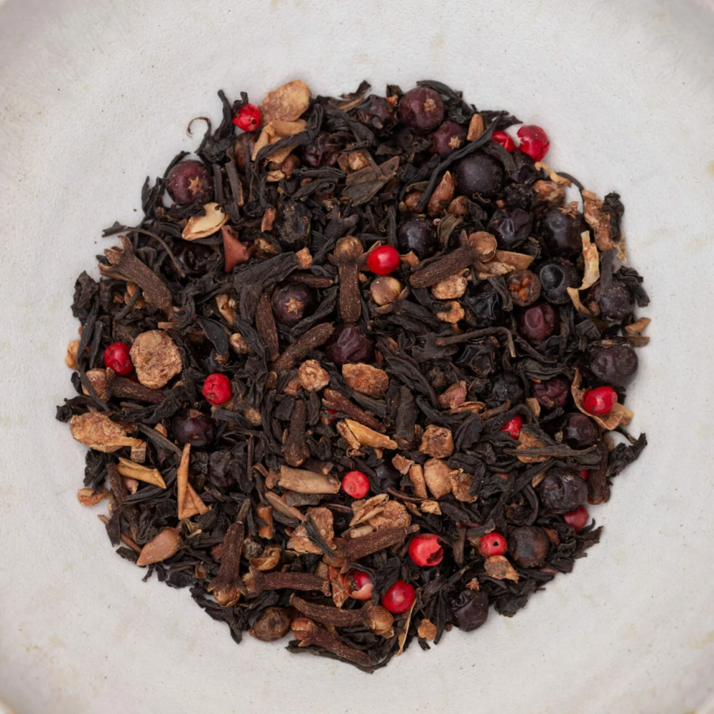 Összetevők: fekete tea, alma, fahéj, szegfűszeg, borókabogyó, rózsabors, édesnarancs illóolaj